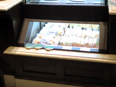 | 店内で作っているサンドイッチを並べています。 背面に引き戸があり、サンドイッチは後ろ側からも入れられます。 引き戸下でホテルパンを冷却する造りになっています。 |