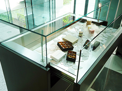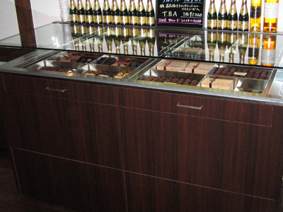 | 老舗の和菓子店様に納入させていただきました。 和モダンなショーケースが品の良いインテリアに調和しています。 こちらのショーケースは、チョコレートに最適な温度管理をいたします。 |