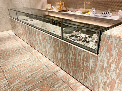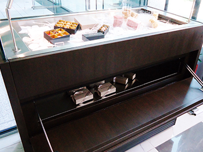 | チョコレートとペストリーとデリカのショーケースを一体化しました。 それぞれのの温度設定は別々に可能です。 腰回りには大理石を使用しています。 |