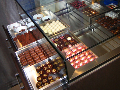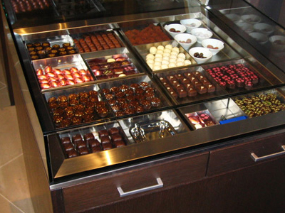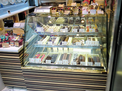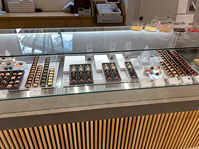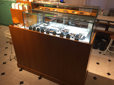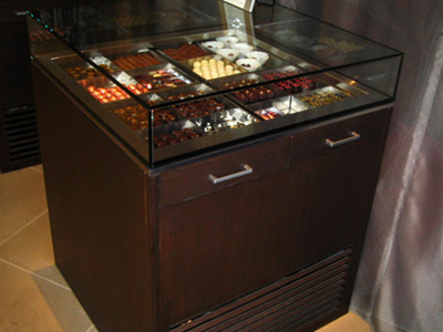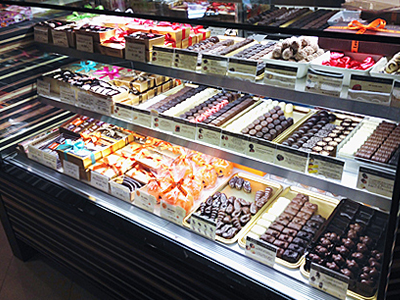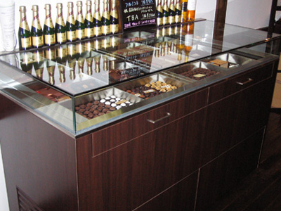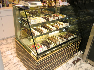 | コーヒーを提供するラウンジでベルギー産高級チョコレートを提供販売しています。 冷蔵ケースは、ヨーロッパの保管環境を作るための、 弊社で開発した専用制御装置を使用しています。 |