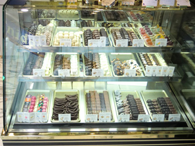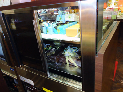 | 洋菓子の銘店です。チョコレートは冬季のみの販売をしています。 チョコレート保冷は、比較的高温で、また低い湿度で制御キープします。 後面から見ると、上段がディスプレイ、下段がストックになっています。 |