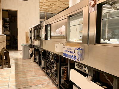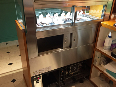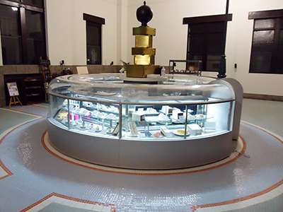 | 歴史的建造物を利用した、ホテルのホールに設置された円形の冷蔵ショーケースです。 ドーナツのような形をしています。6台のケースをつないでいます。 各ケースで「洋菓子」「和菓子」「チョコレート」別に保冷環境設定を変えて使用できます。 |