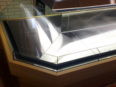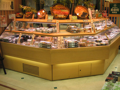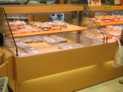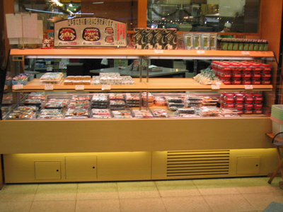 | 横浜地下街の「煮魚」「焼き魚」「惣菜」「お弁当」のお店です。 ケースは上段が「ガラスケース」「下段がオープンケース」に分かれています。 冷凍機1台で上下段とも冷やします。 ショーケースを2台に分割し現場で組み立てました。 |