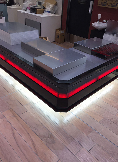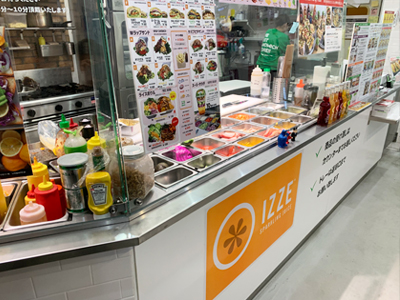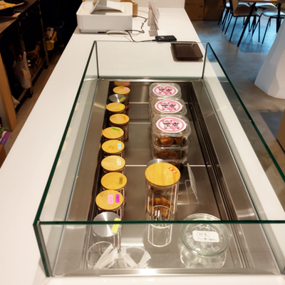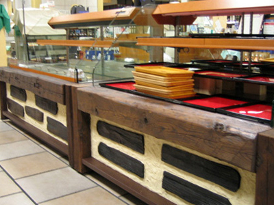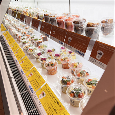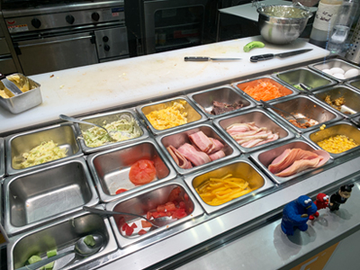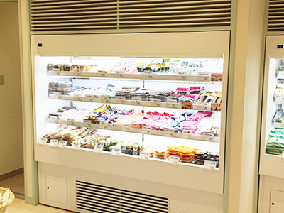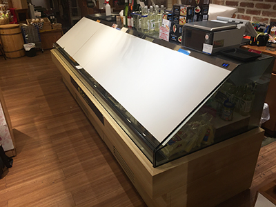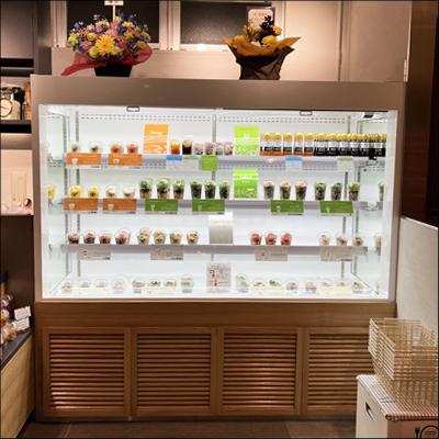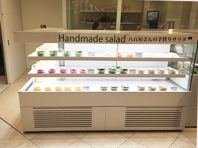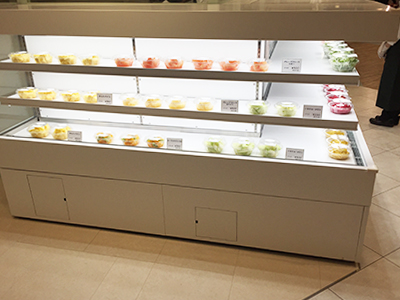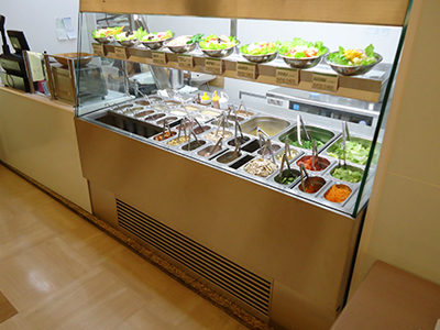 | 木製のカウンターにサラダ用の冷蔵ショーケースを組み込んでいます。 生鮮食品に最適な温度設定ができます。 |