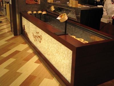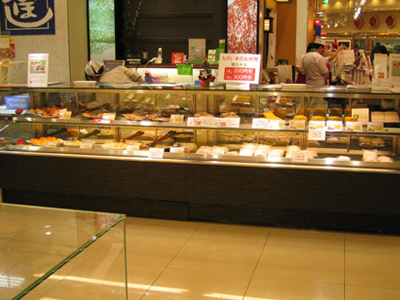 | スーパーマーケット内にある有名寿司店のテイクアウトコーナーです。 L型形状です。 |
