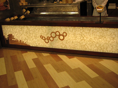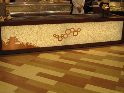 | サービスエリア内、フードコートのお店です。 正面は和紙と銅箔で化粧しており、内側からライトアップしています。 |