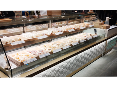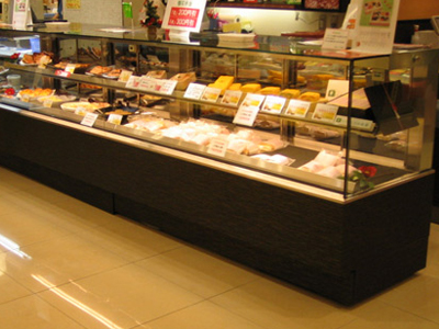 | ガラス面が広く、お客様から食材が見えやすい清潔感のあるショーケースです。 また様々な形のホテルパンに対応可能です。 |