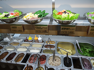 | 「R形状」のサラダバーです。 野菜やドレッシングを入れた容器を適温で冷やしています。 |
