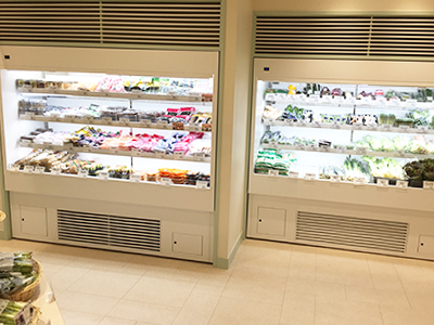 | L型平オープンケースと多段オープンケースを現場で連結し、大きな売り場を構成しました。 L型平オープンケースの左半分は、スイッチ式になっており、冷蔵不要品を販売する場合、スイッチで冷蔵機能を止められます。 |