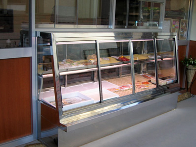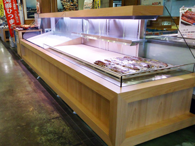 | リゾート施設のショッピングセンターです。 手前が冷蔵オープンケース、奥は氷を敷くケースで丸物を販売します。キャスター付で移動可能です。 3枚目の写真は、施主様が自ら腰板に装飾された大漁旗モチーフです。 業務用の冷蔵ショーケース・冷蔵庫は及川工業にご連絡ください。 |