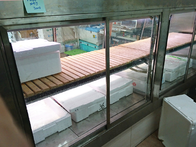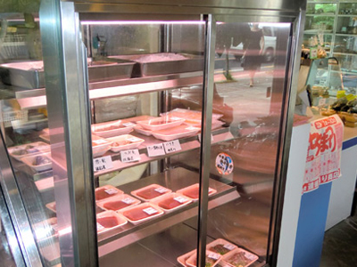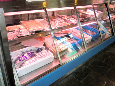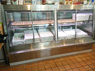 | 住宅地の鮮魚店です。 鮮魚ケースの特徴ですが、前と後に引戸があり、両方から鮮魚を取り出せます。 |