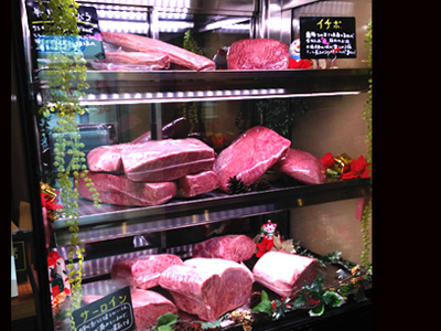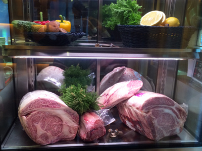 | 鹿児島市繁華街のステーキ店です。 ワイド2200ミリの冷蔵ショーケースに所狭しと肉が並べられています。 正面ガラスは、結露防止機能付で梅雨付きをこしません。 |