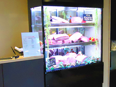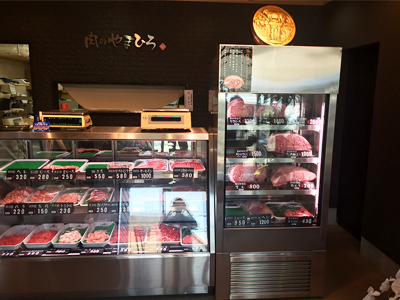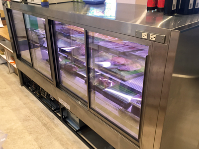 | 入り口入ってすぐのレジカウンター横に設置されています。 高級肉をアピールしています。電源は100Vです。 正面ガラスに微風を吹きかける機能を持っているので、結露しません。 |