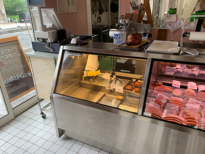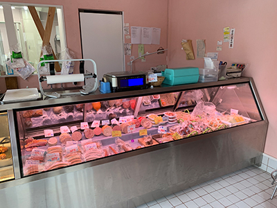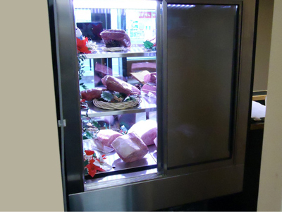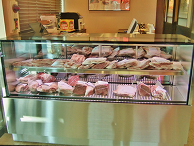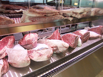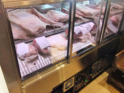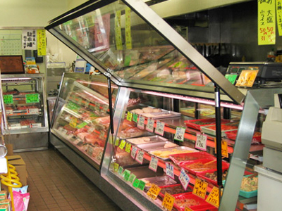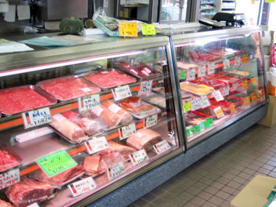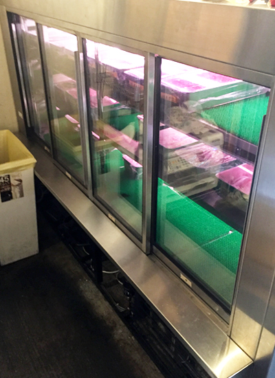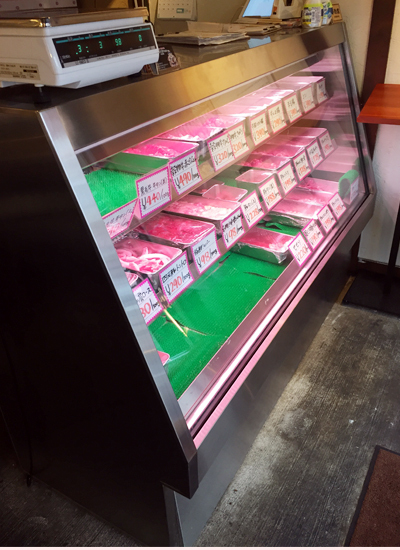 | 街のお肉屋さんです。 右が熟成肉ケース、左が精肉ケースです。 右のケースは冷凍機を内蔵しています 。 左のケースは室外型冷凍機を使っています。 |