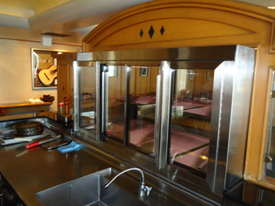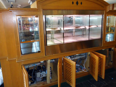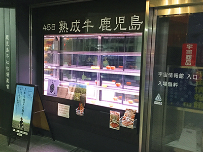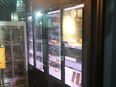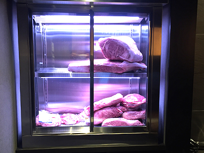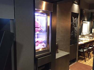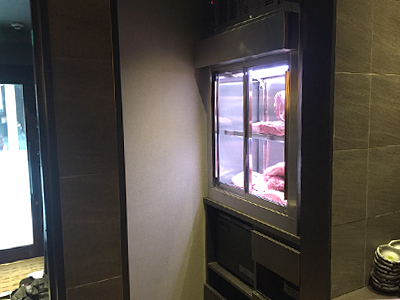 | カウンターの上に設置した肉の熟成ケースです。 カウンター幅が限られていたため、奥行400mmのケースを作りました。 ケースは入り口に置かれ道を行きかう人の目にとまり、お店の看板の役目も担っています。 |