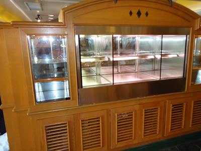 | 冷蔵ショーケース(右側)と温蔵ショーケース(左側)を一体化しました。 ショーケース裏側に横にスライドできるテーブルが付いていて、多用途に使用できます。 |