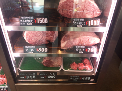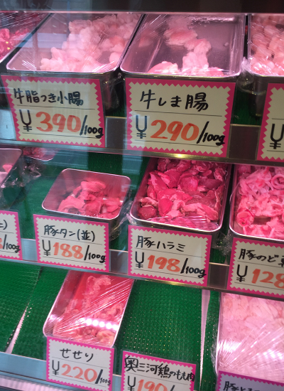 | ホルモンの冷蔵ケースです。 昼・夜とも ホルモン滝のおいしいにおいと煙が立ち込め、大賑わいです。 |