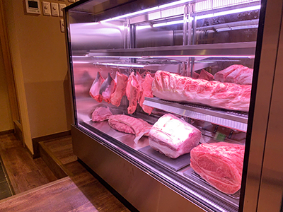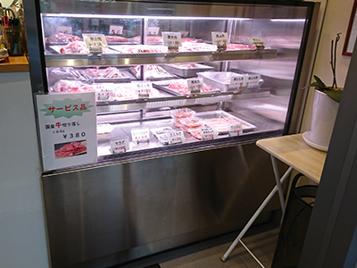 | 焼肉店の入口レジ横で、精肉をディスプレイしています。 生鮮用ランプで際立たせて、お肉を美味しくみせます。 |