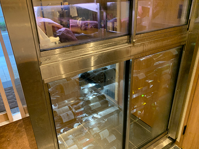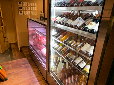 | 精肉ショーケースとワインセラーを並べて設置しました。 どちらもシンプルなデザインで容量もあり、お店のインテリアに溶け込んでいます。 |