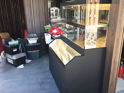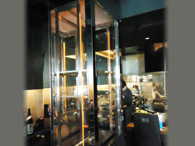 | カウンターの上に設置した肉の熟成ケースです。 カウンター幅が限られていたため、奥行400mmのケースを作りました。 ケースは入り口に置かれ道を行きかう人の目にとまり、お店の看板の役目も担っています。 |