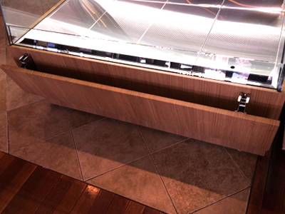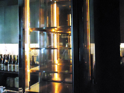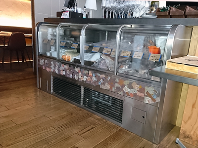 | 生ハムとワインのお店です。 ショーケースの正面の大きな曲げのペアガラスが特徴です。 カウンターの内部にこのケースを冷却する冷凍機を設置しています。 |