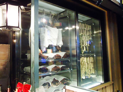 | 店舗のショーウィンドーのすぐ後ろに設備しました。 左が熟成肉用、右がソーセージ用です。適切な温湿度管理をしています。 ショーウィンドーガラスとショーケース前面ガラスの隙間に微風が常に流れるようにして、結露を防いでいます。 |
