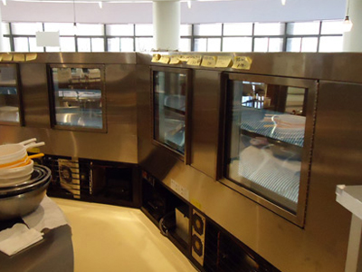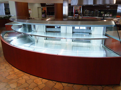 | 学生食堂ホールの中央に設置した扇形のオープンケースです。 2台連結で、ケース後面が扉になっており、食材を供給します。 |