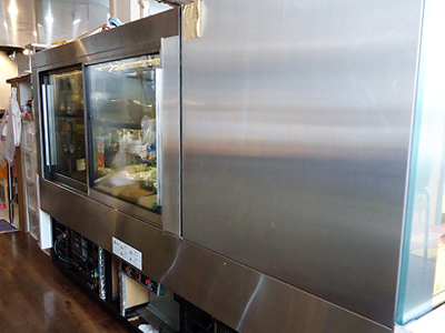 | 冷蔵ショーケースが埋め込まれいるため、カウンター全体がすっきりまとまって見えます。 お手入れもし易く、使い勝手も良好です。 |