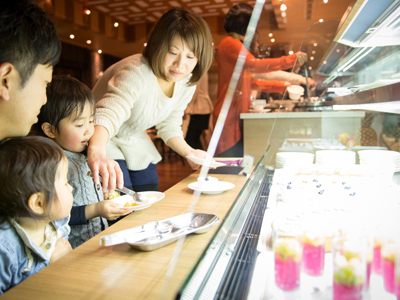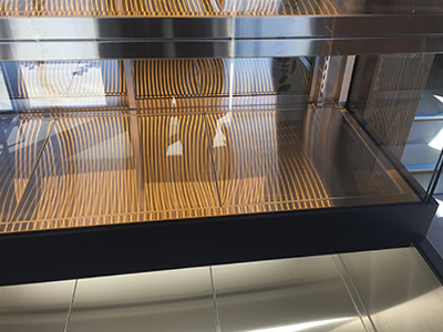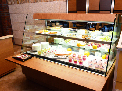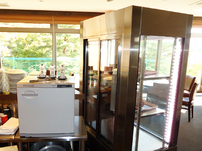 | ホテルのレストランに置かれたオープンケースです。 レストランホールを自由に移動できるよう、キャスターがついています。 足踏み式ストッパーでケースをご希望のスペースに固定できます。 ケース前面に折りたたみ台がついています。 |