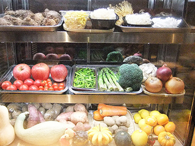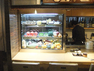 | 野菜料理・鉄板焼きのお店です。 カウンター上の冷蔵ショーケースで、いつでもみずみずしく野菜をディスプレーしています。 |