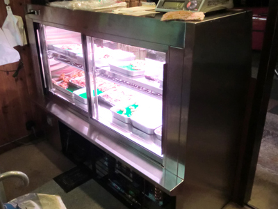 | 入り口入ってすぐのレジカウンター横に設置されています。 高級肉をアピールしています。電源は100Vです。 正面ガラスに微風を吹きかける機能を持っているので、結露しません。 |