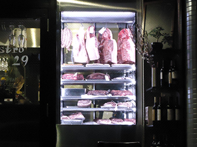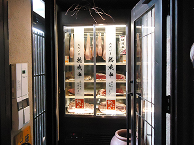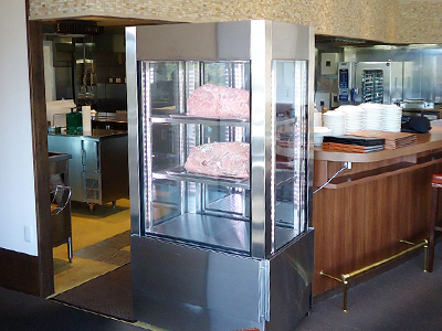 | 熟成肉用の冷蔵ショーケースです。 ガラス張りの入り口から覗き見る肉の塊が大きなインパクトで、来店者を迎えています。 結露防止機能付き。 |