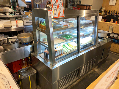 | ガラス部分がカウンターの上に顔を出すケースです。 カウンター内には冷凍機が設置されています。 LED照明で、惣菜を引き立たせます。 正面ガラスは結露防止装置付です。 |