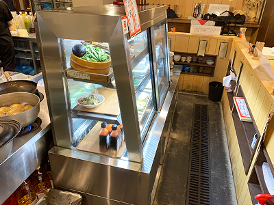 | 上は保湿ケースで下は冷蔵ケースという特殊な製品です。 暖かい食品と冷たい食品を同時にディスプレイします。 |