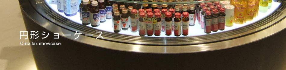 | 特徴 | ディスプレイにインパクトを与える円形の設計です。 棚も円形ながら上下移動可能な構造です。 照明も特注曲げ蛍光管を使用してます。 |