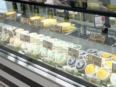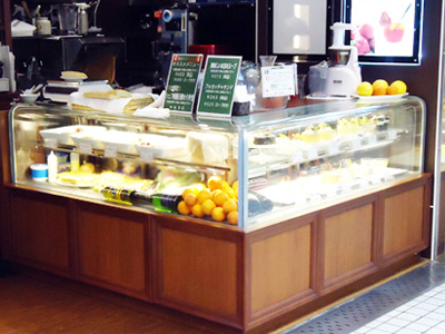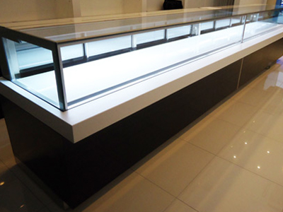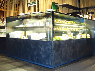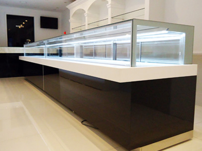 | 店舗のハイグレードな内装にあわせた、ショーケースです。 完璧な温度調節機能・結露防止装置を内蔵しています。 腰には天然石を使用しています。 |