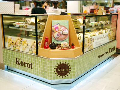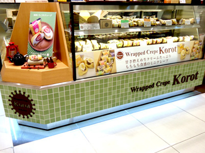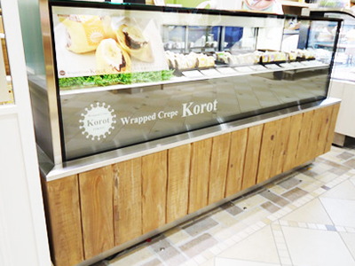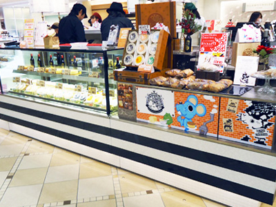 | 「L型」のレイアウトです。 ケーキ2台連結してあります。中央の斜めの部分の展示スペースは左側ケースと一体で製作しています。 アクリルのロゴを取り付けました。 |