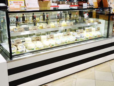 | L型の2台連結ケースです。右と左で庫内温度が別々に管理できます。 レストラン築地ボンマルシェ様の1階に開店しました。 デリ&バルのお店です。 |