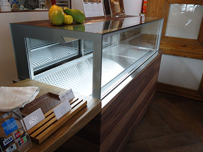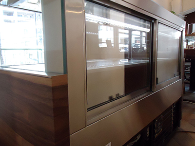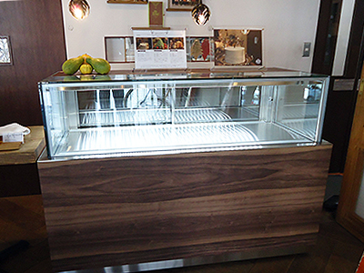 | 既存のカウンターに埋め込んだショーケースです。 デジタル温度調整器で温度管理、自動霜取り機能、LED照明、正面ガラスは結露防止機能、排水は排水受けで取り出し可能。 |
