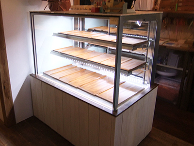 | 焼き菓子保冷用のケースです。ケースをL型に組み合わせています。 左側は非冷部分で冷していません。 右側が冷蔵部です。 中仕切りをして、品物にあった温度管理をしています。 |