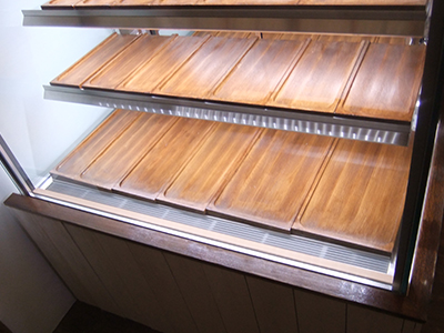 | 天然木の風合いで腰の木工品を製作しました。 このケースは右左で庫内スペースの奥行が違います。 左は奥行が狭いのですが、裏側にレジ台と保存材用冷凍ストッカーを設置してあります。 |